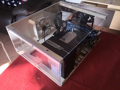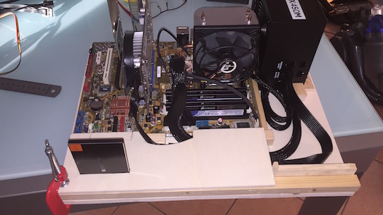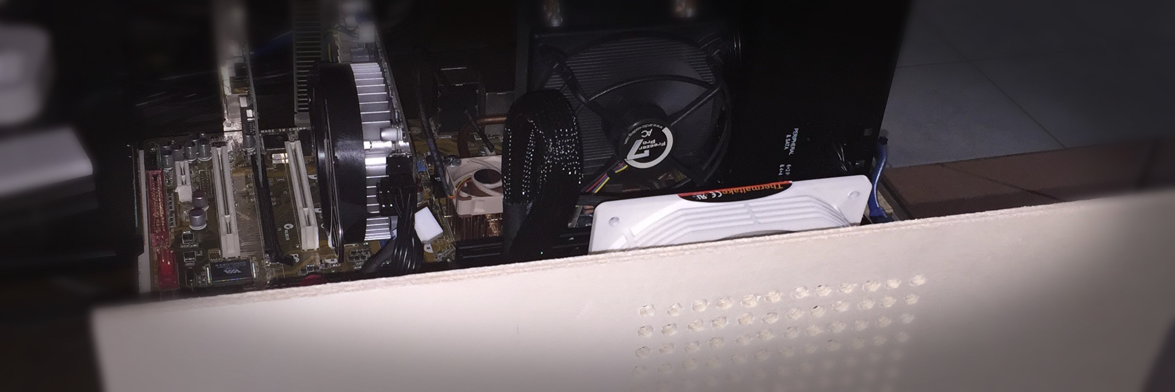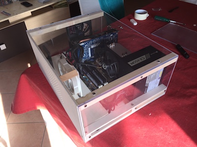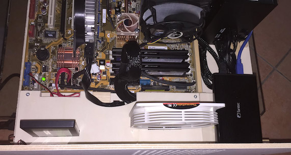L'idea di costruire un HTPC da sistemare sotto al TV, in sostituzione dell'ormai obsoleto EEEPC ASUS 1501, mi è venuta in seguito all'aggiornamento del PC principale che pur avendo una potenza di elaborazione sufficiente per quasi ogni operazione, segnava un pò il passo ogni qualvolta che mancavano le istruzioni necessarie al processore per compiti specifici, come l'elaborazione video, la programmazione di semplici App per smarphone ecc... Avendo aggiornato scheda madre, processore e RAM, mi avanzavano questi tre componenti e il pensare di relegarli in un angolo o svenderli a prezzo irrisorio mi dispiaceva molto. Ho cercato quindi case ATX che potessero fare al caso mio ma tutti quelli trovati in commercio sono risultati enormi o enormi e troppo costosi per destinarli al recupero di componentistica da PC, in teoria dismessa. Alla fine ho deciso che avrei provato a costruirmelo da solo, compattando tutto al massimo possibile, per restare all'interno delle misure necessarie che sono 43cm di larghezza, 35cm di profondità e 20 cm di altezza. I componenti in questione sono scheda madre Asus P5K-R, CPU Intel Core Duo Quad Q9400 95Watt di TDP, equipaggiati da 8GB di RAM Corsair. Inizialmente, nell'immagine in alto i più attenti noteranno che avevo utilizzato una scheda video diversa da quelle nelle immagini finali e cioè una Sapphire Radeon HD 4830, purtroppo durante le prime prove non si è dimostrata all'altezza di gestire il pannello collegato. Ho di conseguenza optato per l'utilizzo della scheda video Sapphire Radeon HD 7850 rubata al computer principale, non avendo al momento necessità di utilizzarlo per gaming, usando al posto della scheda video discreta, l'integrata della nuova CPU, in grado di gestire i flussi 4K.